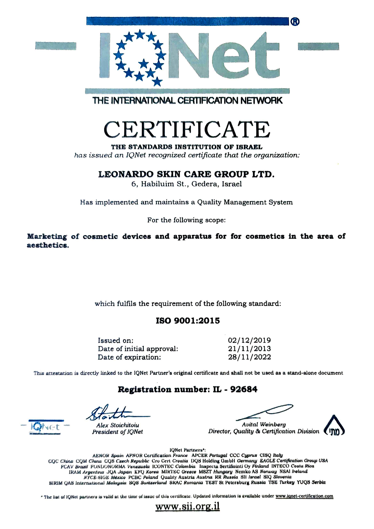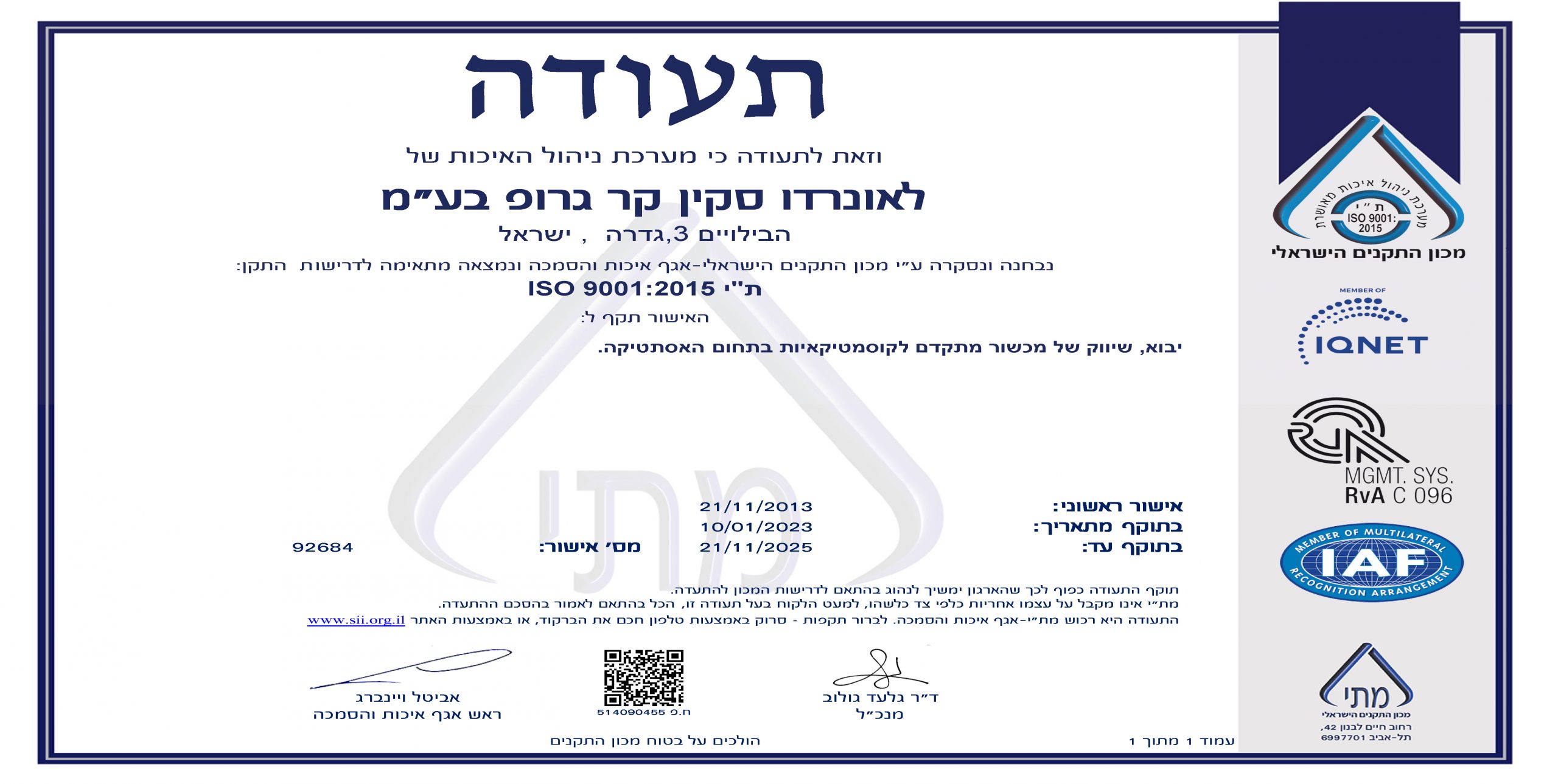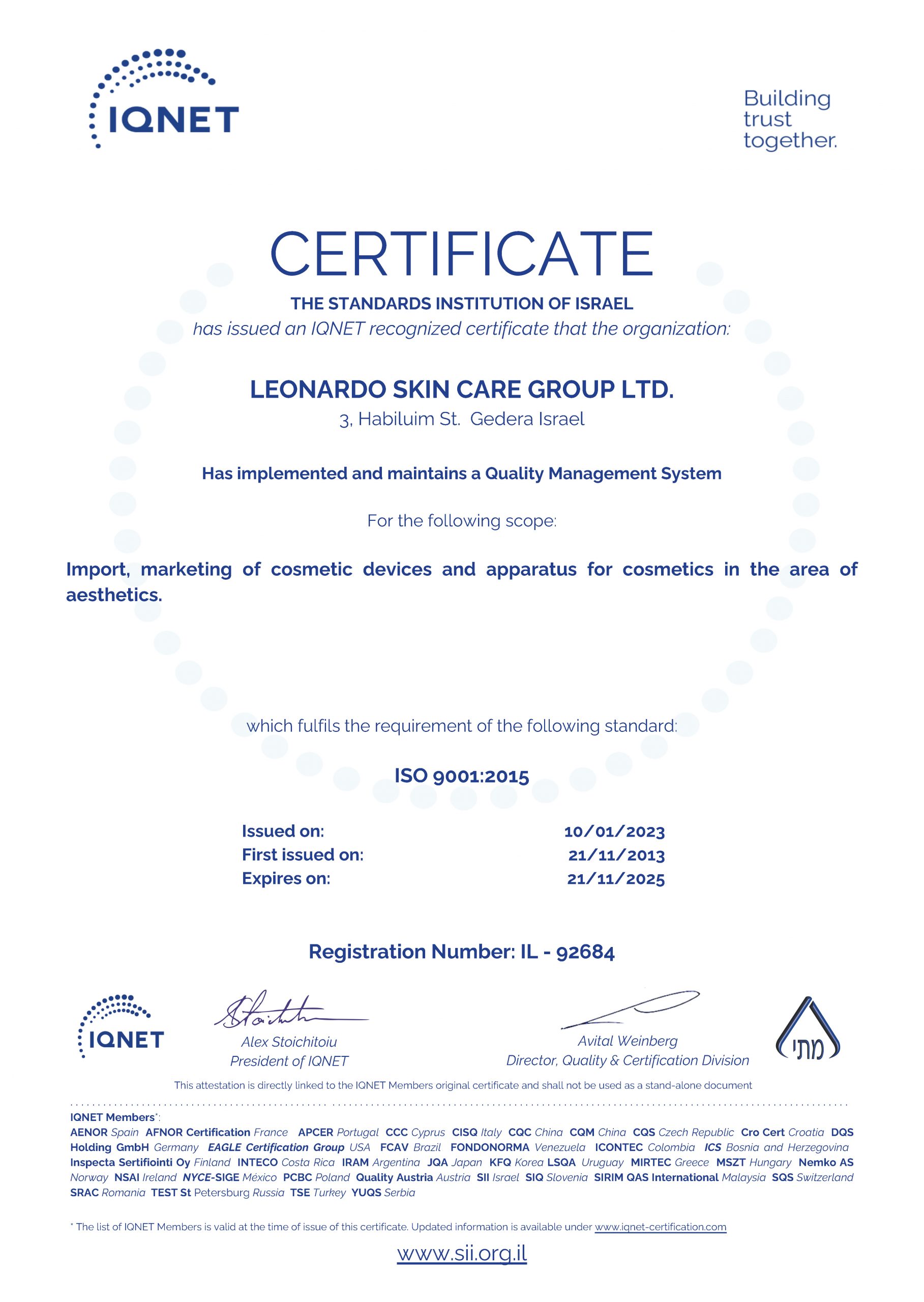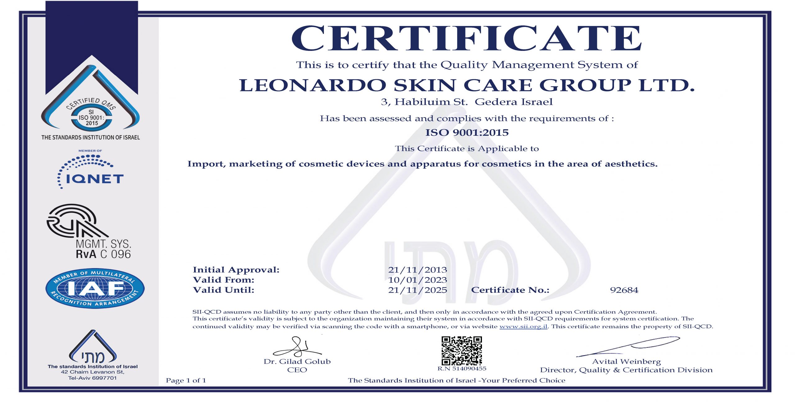 חברת לאונרדו קוסמטיקה, מייצרת מכשור טכנולוגי מתקדם ביותר לקליניקות ומכוני יופי, כאן בישראל, במפעלי לאונרדו העובדים תחת התקן הרפואי המחמיר ISO13485 וכמובן ISO9001 , ובשיתוף חברת אלבטק ייצור ,בחטיבה האזרחית, אשר נמצאת באשדוד ועובדת תחת התקן התעופתי המחמיר AS9100, תחת תקן מדיקלי ISO13485 וכמובן ISO9001.